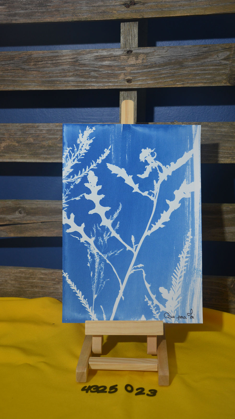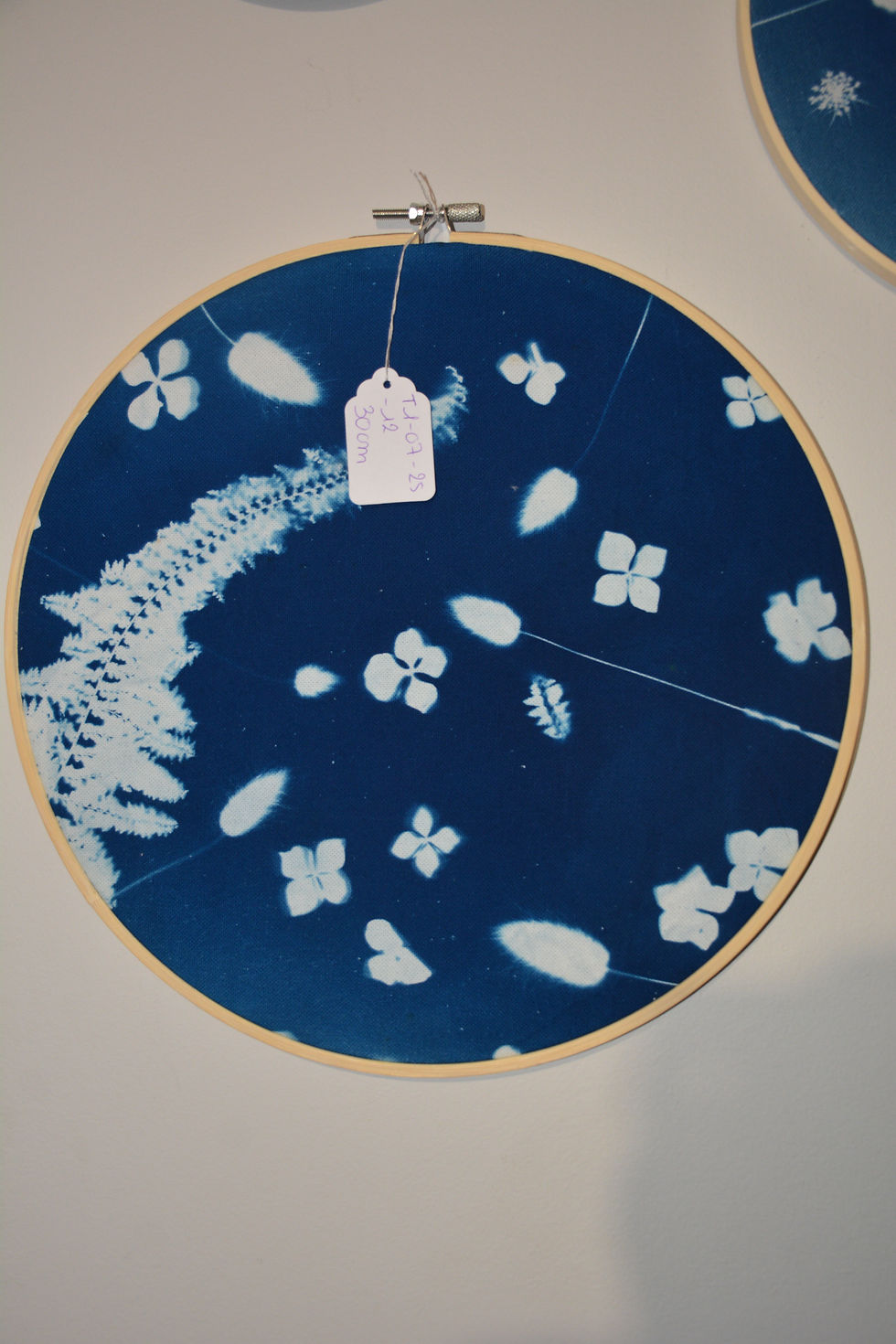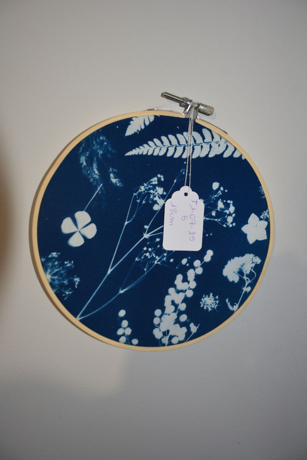 Je réalise des cyanotypes sur papier et sur tissu, délicatement tendus dans un tambour en bambou.